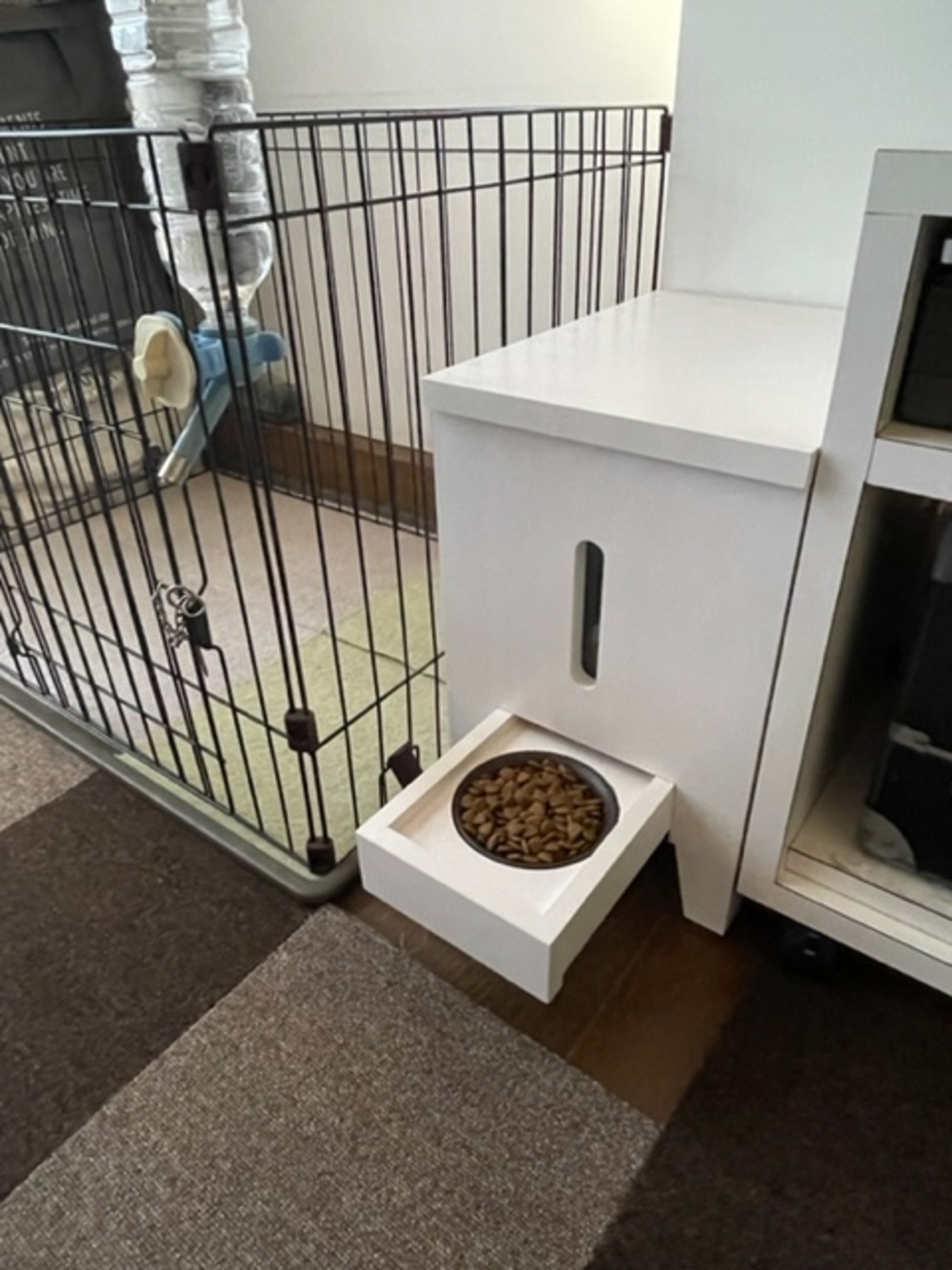 使い方は、簡単で、蓋を開けてプラスチック容器の中に、ドライフードを1kgの半分くらい入れて下さい。残ったドライフードは、BOXの後ろ側に入れて保管して下さい。後は落とし蓋をして扉を閉めて下さい。ご飯の時間が来たら、ゆっくり引き出しを引いて頂けたら、1回分のご飯が出て来ます。食べ終わったらお皿を新しいものと交換して引き出しを閉めましょう。食べ終わったお皿は洗って、またBOXの中に納めておきましょう。