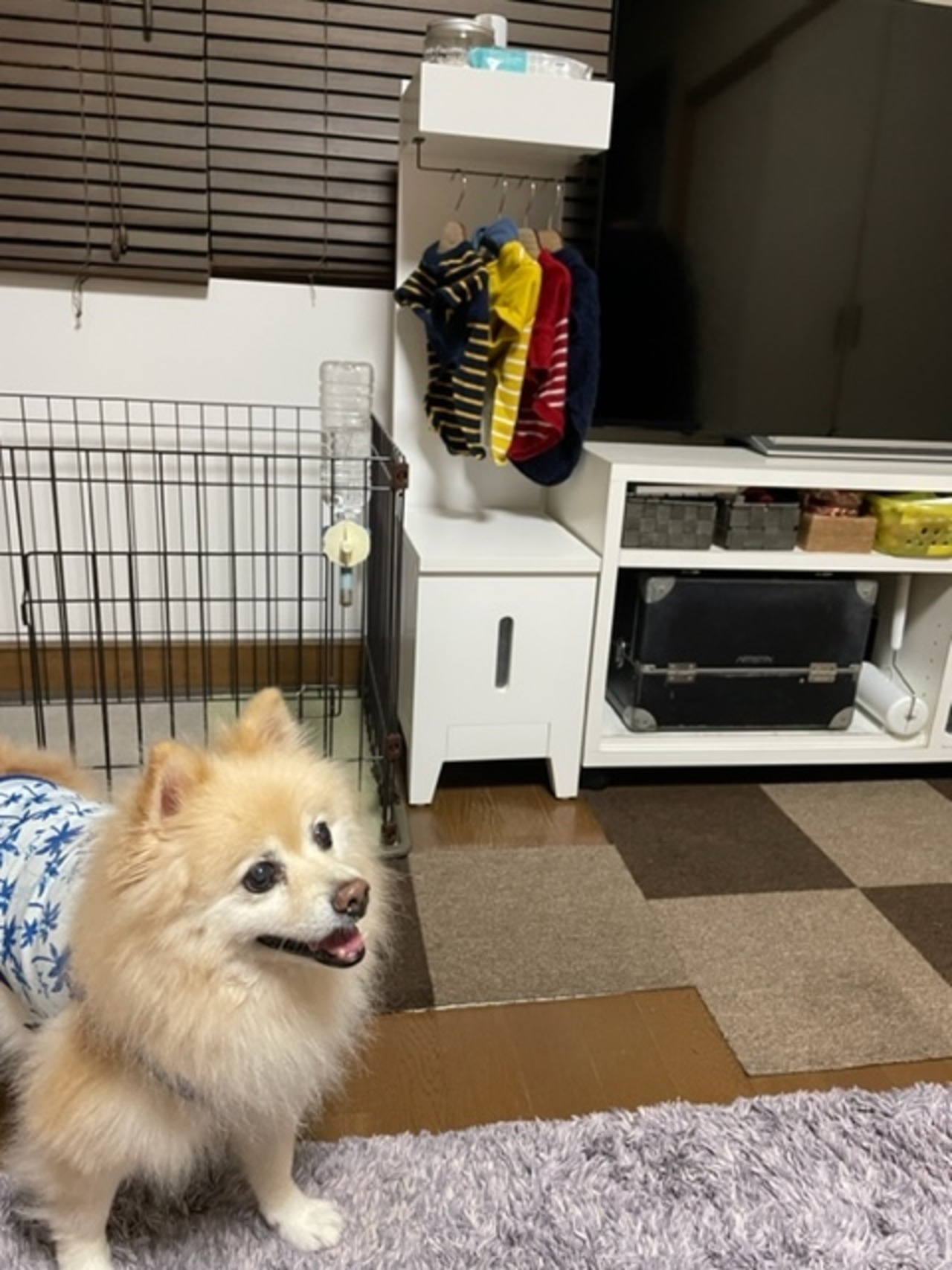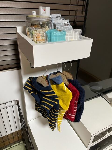 上部には、収納棚を付けておりワンちゃんのおやつやペットシート、ブラシ、オムツなどの小物を収納する事が出来て大変便利です。棚下に洋服掛けが付いているので、お洋服を飾って、可愛いお洋服を着せてあげましょう。