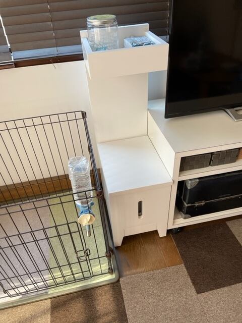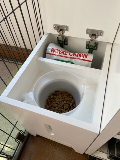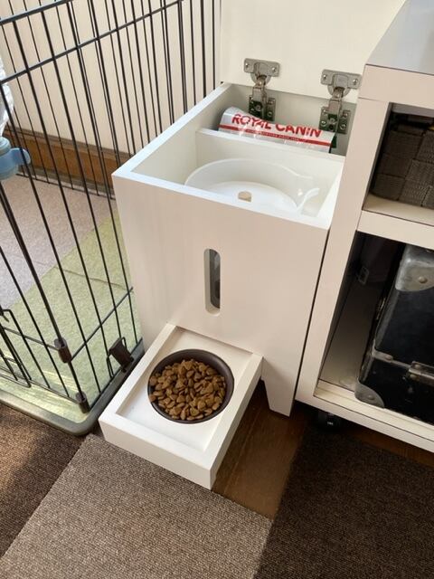 使い方は、簡単で、蓋を開けてプラスチック容器の中に、ドライフードを1kgの半分くらい入れて下さい。残ったドライフードは、BOXの後ろ側に入れて保管して下さい。後は落とし蓋をして扉を閉めて下さい。ご飯の時間が来たら、ゆっくり引き出しを引いて頂けたら、1回分のご飯が出て来ます。食べ終わったらお皿を新しいものと交換して引き出しを閉めましょう。食べ終わったお皿は洗って、またBOXの中に納めておきましょう。Bタイプは収納棚を付けておりワンちゃんのおやつやペットシート、ブラシ、オムツなどの小物を収納する事が出来て大変便利です。